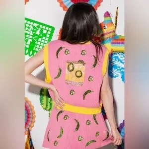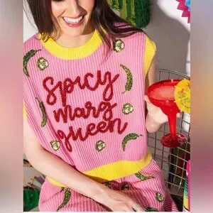 Gorgeous Queen Of Sparkles pink vest top featuring lightweight sweater material, sequined jalapenos, sequined margarita on the back, sleeveless, and oversized fit.