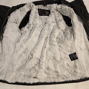 Shell is 100% polyurethane. Faux Fur lining is 100% polyester. Does not have the hood. Deep dark brown with silver zipper detail. The lining is incredibly soft faux fur. 2 zip hand pockets and 2 fake chest zip pockets. Has some tears in the inside of the collar, as shown. Size small but fits more like an extra small. Please compare measurements to something similar to ensure fit.