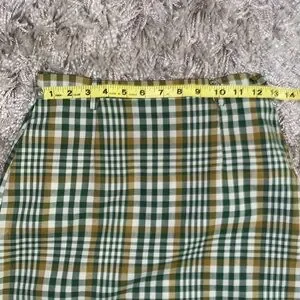 Vintage 1960s/1970s green plaid pencil skirt. Perfect for fall and for the office with some loafers. 12 inch across waist and 22 inch length. Has loops for a belt and two back pockets, one with a button closure.