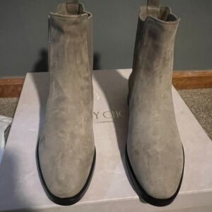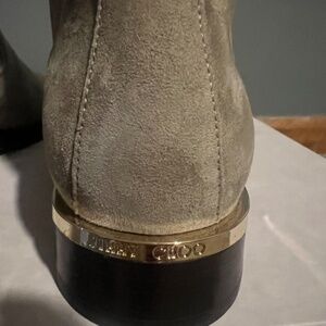 Jimmy Choo Thessaly boot In Taupe. Suede. Pull on style. new with box and dust bags. Size 39. Gold accent on back of each boot. All sales final.