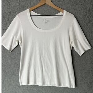 2. white, short modest sleeve, scoop neck; cotton spandex blend