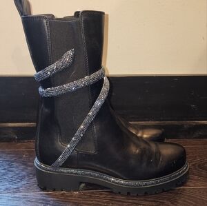 bee stunning black leather boots feature a crystal embellished snake feature that wraps around the shaft as well as Crystal detail around the soul. crystals are a gunmetal color. slight fine scratching on the toes, in great condition. perfect addition to your wardrobe for fall currently retailing at bergdorf Goodman for $2030