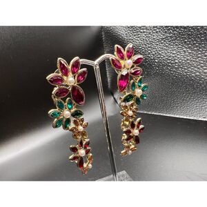 Long gem earrings with multi-colored flowers. Looks like a poinsettia to me!