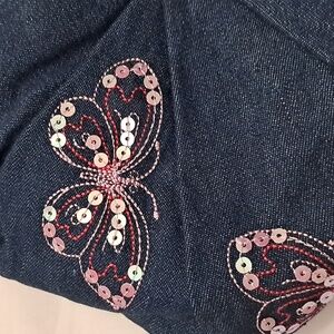 News Boy Denim Cap Women's One Size with Pink and Red Embroidered Butterfly with Sequins. NWOT 22.5 inch diameter