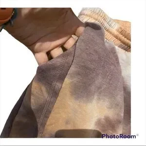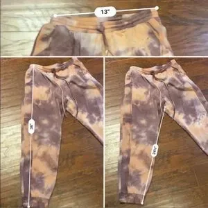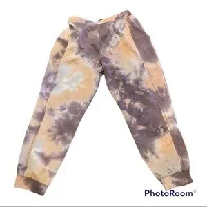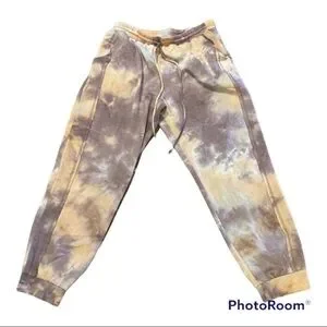 Cute and comfy sweat pants from Altar’d State Intimates. Tie dye with purple, pink and peach shades. Raw edge detail down legs. Functional pockets. Drawstring at waist. Fabric has some stretch. Excellent preowned condition. See pictures for approximate measurements. Keep in mind waist as measured unstretched.