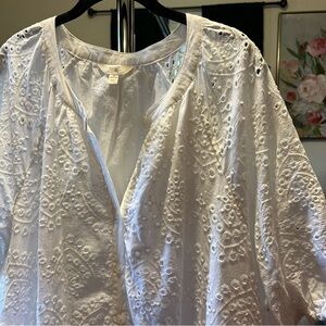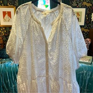 White eyelet babydoll dress. Knee length on me. Good condition. No discoloration. Cat not included.