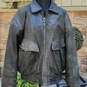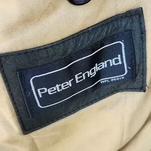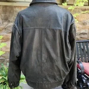 A vintage Peter England black leather jacket in a classic bomber style. It has 2 large snap pockets with 2 slash pockets under the snap pocket and a heavy full zip front. The underarms are vented and this has a polyester fill for an insulated warm feel. The cuffs have a snap closure and it has the classic elasticized hem. It's lined in a beige cotton fabric with one interior pocket trimmed in leather. It measures, laying flat 26" underarm, 22.5" at hem, 23.5" sleeve length, 22.5" shoulder to shoulder, 25.5" from the nape of the neck to the hem. The only flaws I find is 2 small, very faint marks on the right sleeve and faint scratches on the same sleeve but this is truly overall in wonderful condition. Pic 9 is the best representation of color. This is a heavier jacket like the classic aviator bomber. Thanks for looking!