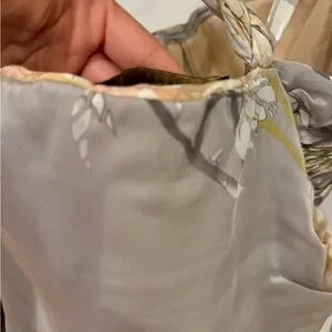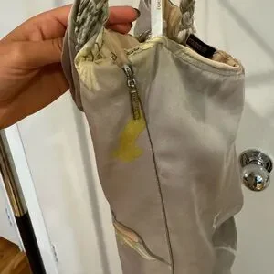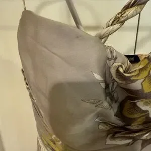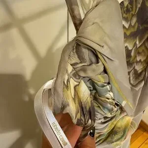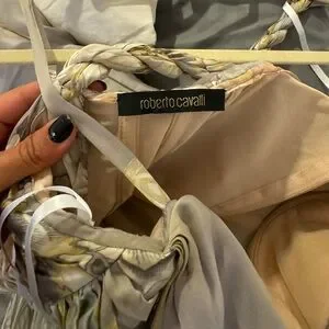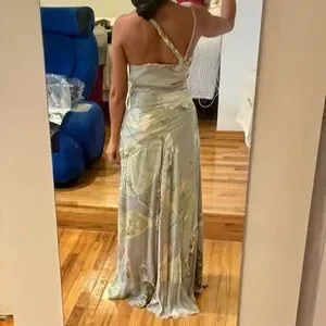 ROBERTO CAVALLI GRAY & FLORAL PEONT GOWN SIZE 38. STUNNING GOEN. WORN ONCE TO A WEDDING. RECEIVED SO MANY COMPLIMENTS ON IT. INNER BODYSUIT AS SHOWN. ROUGING ON THE SIDE. TWISTED SHOULDER STRAP. STAINS AND OULLS AS SHOWN. UNDONE HEM. ALL SHOWN IN PHOTOS. INCREDIBLE DRESS. ONKY SELLING IT BECAUSE IT IS TIGHT ON ME.