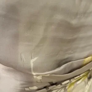 I WILL ALSO SEND THE EXTRA FABRIC I SAVED FROM WHEN I HAD THE FITTED (EXTRA FABRIC SHOWN IN PHOTO). PLEASE UNDERSTAND THESE PIECES WERE CUT FROM THE ORIGINAL DRESS SO THEY’RE NOT PERFECT. THEY HAVE FRAYED EDGES.