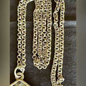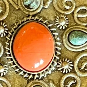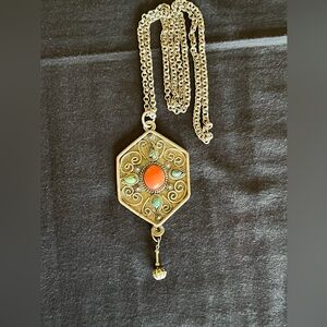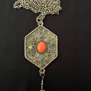 Very interesting piece. Appears hand made; possibly Chinese or Tibetan. A large amulet/pendant inlaid with coral and turquoise (not an expert, but I believe the stones are real). Silver tone double link infinity chain (no clasp). The links even have a textural design. Please zoom the photos to see additional detailing and size. The turquoise stones look a bit rough, coral is solid. I'm sorry I don't have more information, it's very interesting; no marks found. Great statement piece of jewelry.