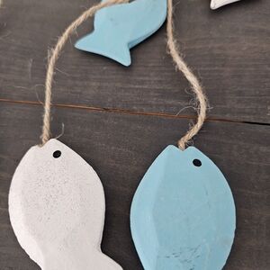 Wood sailboat wall hanging with 6 little wood dangling fish in blue and white. 21" overall - sailboat is 8" tall x 7" wide