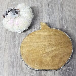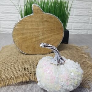 This is a beautiful Bundle of sparkly farmhouse style Fall decor. Solid wood pumpkin with sequined rim and a sparkly white sequined plush pumpkin .....Excellent like new condition