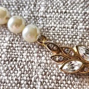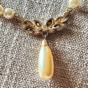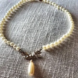 Elegant vintage necklace Faux pearl beads with a teardrop shaped faux pearl pendant Gold tone metal focal piece in the front with sparkly clear faux gems. It's in good preowned condition.