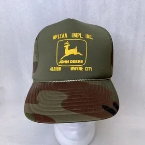 John Deere Vintage Trucker Hat Cap Insulated Foam McLean Implement Inc Camo NWOT. The condition is New without Tags.