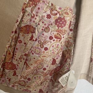 This is a lovely Tilley travel blazer with buttoned front and mock neck. This has four pockets on the outside, and a zippered pocket on the inside. The inside seams and inner pocket are accented with a cheerful paisley fabric. The jacket is sturdy, stretchy, and very comfortable and versatile for a variety of occasions. It's in excellent condition with minimal wear.