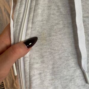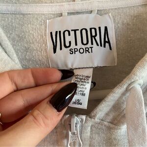 Victoria’s Secret hoodie from the Victoria sport line. Gray hoodie with white stripes down the arm with the logo reading Victoria sport. Comfy and relaxed fit. Good condition - small spot on front as pictured last photo. Size L.