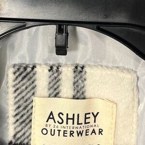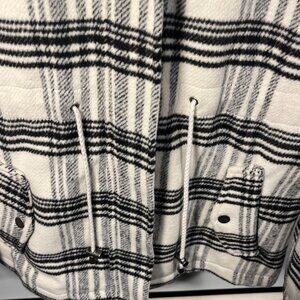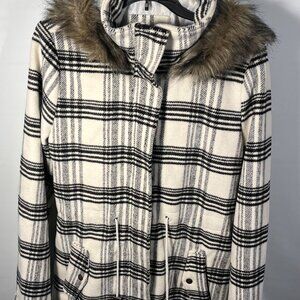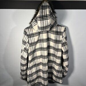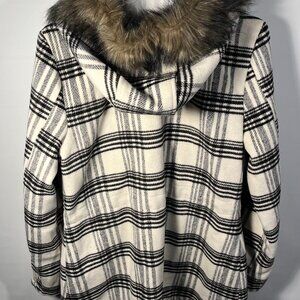 Ashley by 26 Internation Outerwear women's wool blend black and white plaid winter coat with faux fur trimmed hood and drawstring waist. Size L