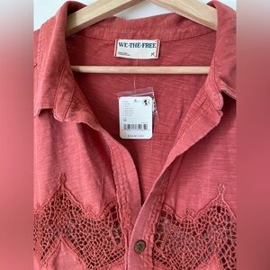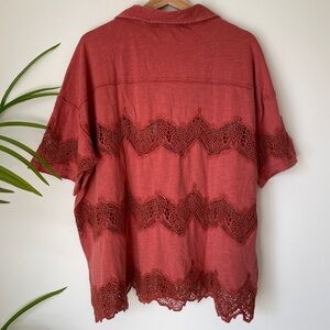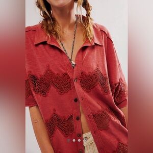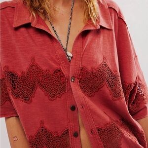 A button-down with a twist! This short-sleeve from our We The Free collection features a soft cotton fabrication and slouchy, relaxed fit with a collared-neckline and contrast lace piecing.