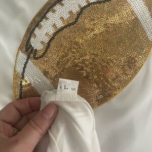 White dress with gold sequin piping around the arms and bottom. Center chest gold sequin football. Very cute for any sporting event. Never worn. Perfect condition. Smoke-free home.