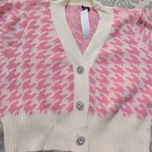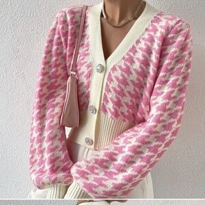 Pink Preppy Womens Houndstooth Pattern Lantern Sleeve Cardigan