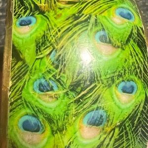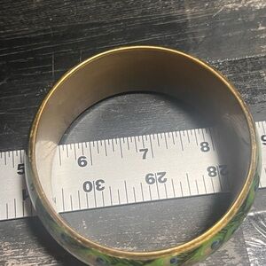 Vibrant peacock feather pattern beveled bangle bracelet in antique gold. Used, with regular wear and tear on edges and interior. Fits plus size! (Likely purchased at Lane Bryant)