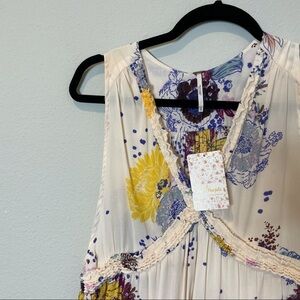 Purple Haze Tunic in Blush Pink Free People floral purple haze tunic in blush pink. Bohemian vibe, pullover style, tierred detail, floral print. V-neck Flowy hem Tierred detail Sleeveless Color: Blush pink, Yellow, Purple, Blue 100% Polyester Size
