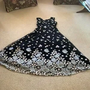 Sheer black, embroidered with flowers. Fully lined. Like new. Worn once. Full length. Formal.