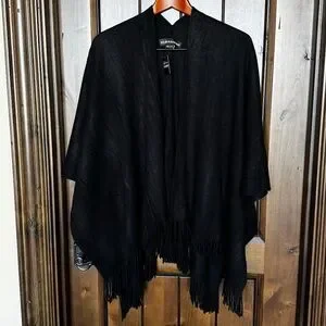Sylvia Alexander Fringe poncho wrap. Nice weight for airplane or dinner. Open in front, no closure. Perfect to wrap.