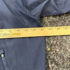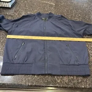 ATHLETA Women’s Bomber Jacket Navy Blue Size M. The back has pretty drawstring detail in black. This is a nice thin material for when you need a light jacket.