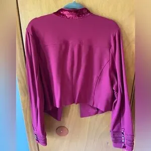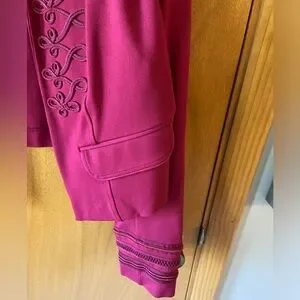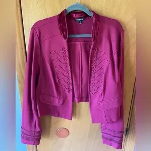 Stunning Torrid military inspired crop jacket/blazer. Vibrant pinkish maroon color. Faux front pockets. Embroidered, braided trim and button details. Velvet accent trim. Princess seams. Stand up collar. Fitted. Runs small. Machine wash.