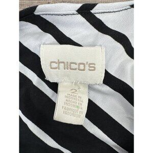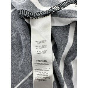 This beautiful Chico's maxi dress is perfect for any occasion. The dress features a stunning striped pattern in white and black, with a round neckline and short sleeves. It is made of a comfortable and stretchy blend of polyester and spandex, ensuring a perfect fit for size 2 women.