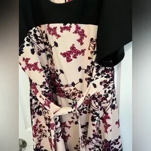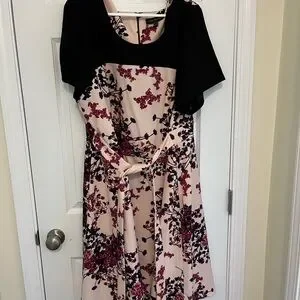 NWOT - beautiful pink floral print with contrasting bodice and short sleeves. Tied belt, zipper in back. 26/28
