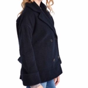 A comfortable boucle knit adds cozy style to this double breasted pea coat.