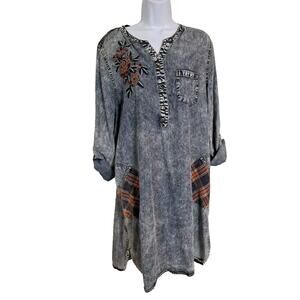 John Mark Chambray Shirt Dress Sz L Adjustable Sleeves Embroidered Plaid Patches