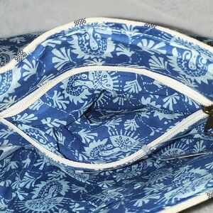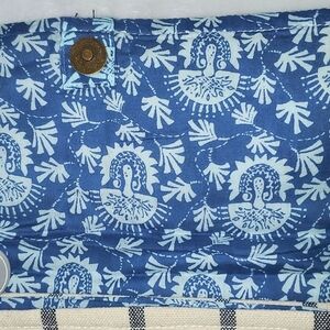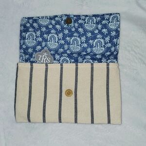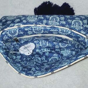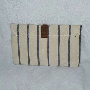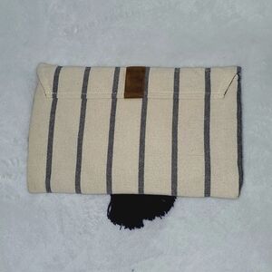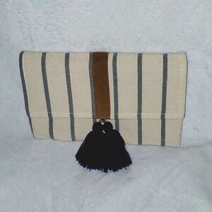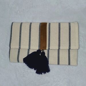 Striped clutch with tassles and a fun patterned interior lining. Perfect for use on its own or to help organize your items in a larger bag.