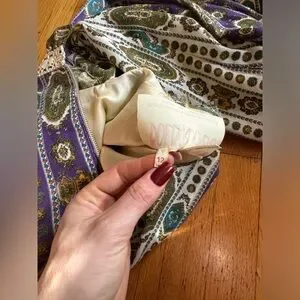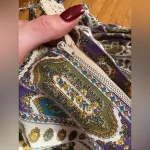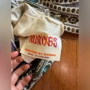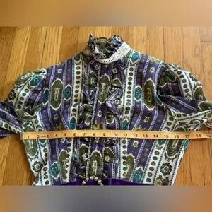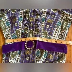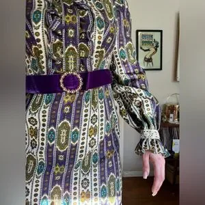This is a gorgeous 1970s Victorian revival dress made by dollyrockers. Long sleeved with a high neckline and floor length, the dress is made of a cotton blend fabric that’s covered in horizontal stripes that look like ribbons of greens, whites, and purples. The dress is belted at the waist with a purple velvet ribbon that has a circular rhinestone buckle. The dress has frilly lace along the bust, and frilly lace along the high neckline. The shoulders are slightly puffed and there is a slight bishop sleeve with buttons that close at the wrist. The wrists also have lace detailing. Very whimsical! Overall in good vintage condition - some yellowing and spilt seams under one armpit as seen in pics. Marked a size 12 - see measurements in photos for best fit. Approx a small. Very love which vibes!
