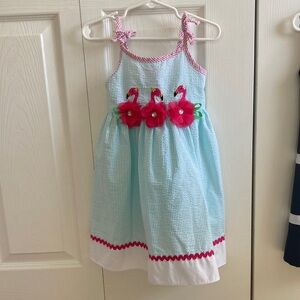 Set of two 5T dresses. Flamingo dress is in great shape! No stains or tears on both dresses. The navy blue dress has a loose bow that can be fixed with a stitch!