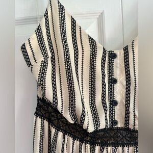 Get ready to turn heads in this dress! This long dress features a trendy stripe pattern. Adjustable spaghetti straps, black lace accents, slightly ruffled bottom, faux button design, elastic on mid back. Lightweight with nude lining for the top 1/2 of the dress.