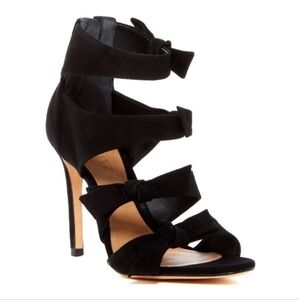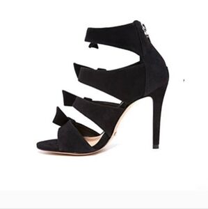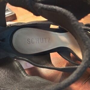 These Miranda suede bow strappy heels by Schutz are perfect for date night or a special event. They are 100% leather. They have sexy straps with bows and a rear zipper closure with gold-toned hardware. Size 7.5; Made in Brazil. Excellent condition, with some glitter residue.