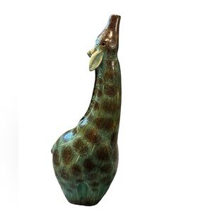 This eye-catching vintage giraffe vase is a striking piece of mid-century pottery. With its charming giraffe design, green and brown speckled glaze, and hollow interior, this vase is as functional as it is decorative. Although it has the appearance and feel of carved wood, it is actually crafted from pottery with a white, hollow interior, making it lightweight yet sturdy.
