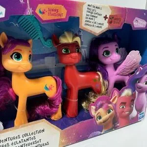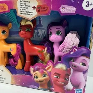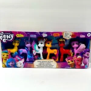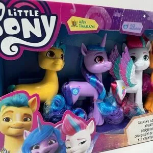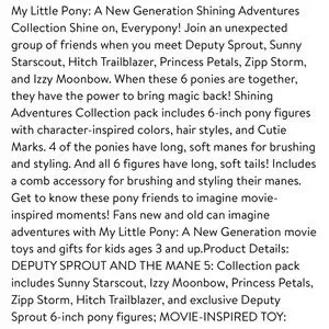 Fans new and old can imagine adventures with My Little Pony: A New Generation movie toys and gifts for kids ages 3 and up.Product Details: DEPUTY SPROUT AND THE MANE 5: Collection pack includes Sunny Starscout, Izzy Moonbow, Princess Petals, Zipp Storm, Hitch Trailblazer, and exclusive Deputy Sprout 6-inch pony figures; MOVIE-INSPIRED TOY: Imagine friendship adventures with My Little Pony: A New Generation movie figures, accessories, and playsets (Each sold separately); SHINE ON, EVERYPONY: Get to know a group of pony friends with glowing personalities!; HAIR STYLING FUN: 4 of the ponies have soft manes and tails for brushing and styling. Comes with a comb for hair play fun for girls and boys; 7 PIECE COLLECTION PACK: Includes 6 pony figures and 1 comb accessory for styling their hair. Toy makes a great gift for kids ages 3 and up