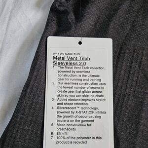This Lululemon Metal Vent Tech Sleeveless tank is a versatile piece for any activity. The crew neck and pullover closure provide comfort and ease while the slim fit offers a flattering silhouette. The lightweight and moisture-wicking features make it perfect for gym & training, walking, school, cross-training, skateboarding, yoga, running & jogging. The tank is available in XLarge size and comes in a beautiful Black color. The metal theme adds a touch of edginess to the basic style.
