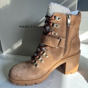 Gorgeous Marc Fisher Nature Suede Sherpa Trim Lug Sole Hiker Boots in a Medium Brown Color with Side Zip Closure, Goldtone Hardware, Faux Fur Tongue, Tape-On Velcro Strap with Goldtone Embellishment and Lace-Up Feature. Almond Toe with a Man-made Sole That is Slip Resistant. Stunning Bootie in Person!