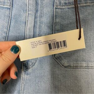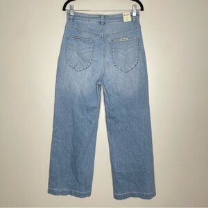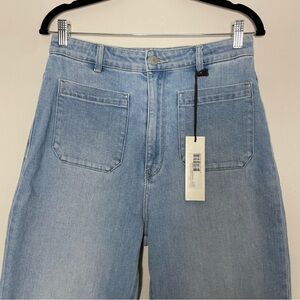 New with tags size 31 high rise stretch cotton light wash patch pocket ankle sailor wide leg jeans. Waist measures 14” across, rise is 13.25” and inseam is 28.5”