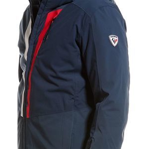 About the brand: Iconic French ski wear driven by athletes. Summit Stripe Jacket in dark navy with hooded back, chest pocket, two front hand pockets, zippered sleeve pocket, interior snowskirt and inner drawcord at hem Approximately 30in from shoulder to hem Zipper front 87% polyamide, 13% elastane Contrast: 100% polyester Lining: 100% nylon Padding: 100% polyester Machine wash Imported