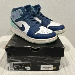 Gently used 5.5 youth Air Jordan 1MID (GS) mystic navy/mint foam white blue marine mystic