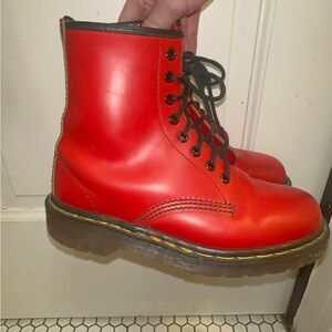 Made in England, The Original, red dr marten boots. Still in good condition with minor scuffs and scratches. Size 5 men’s, women’s 7. I’m a W7 and they fit perfectly