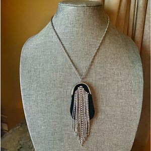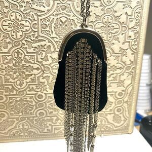 Black velvet tiny purse/pouch pendant with multiple silver tone chains and rhinestone chains dangling from front. On a long silver tone chain measuring approx 31”