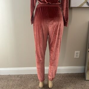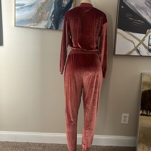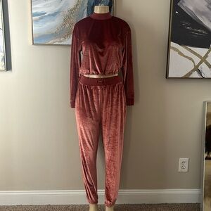 Crushed pink velour tracksuit set. Top size 2 and bottoms is an 8-10 US. Long sleeve top with high neck and drawstring waist clinch. Pants are high waisted and drawstring.