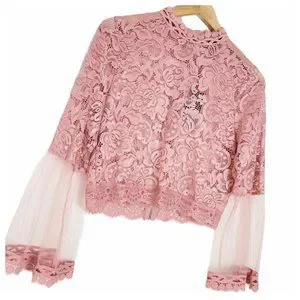 Gorgeous and unique Love University blush rose mauve sheer lace crop top with mock neck, sheer mesh bell sleeves, & zipper back closure.